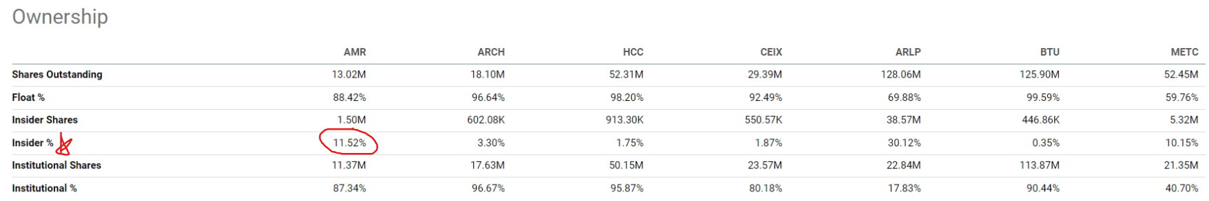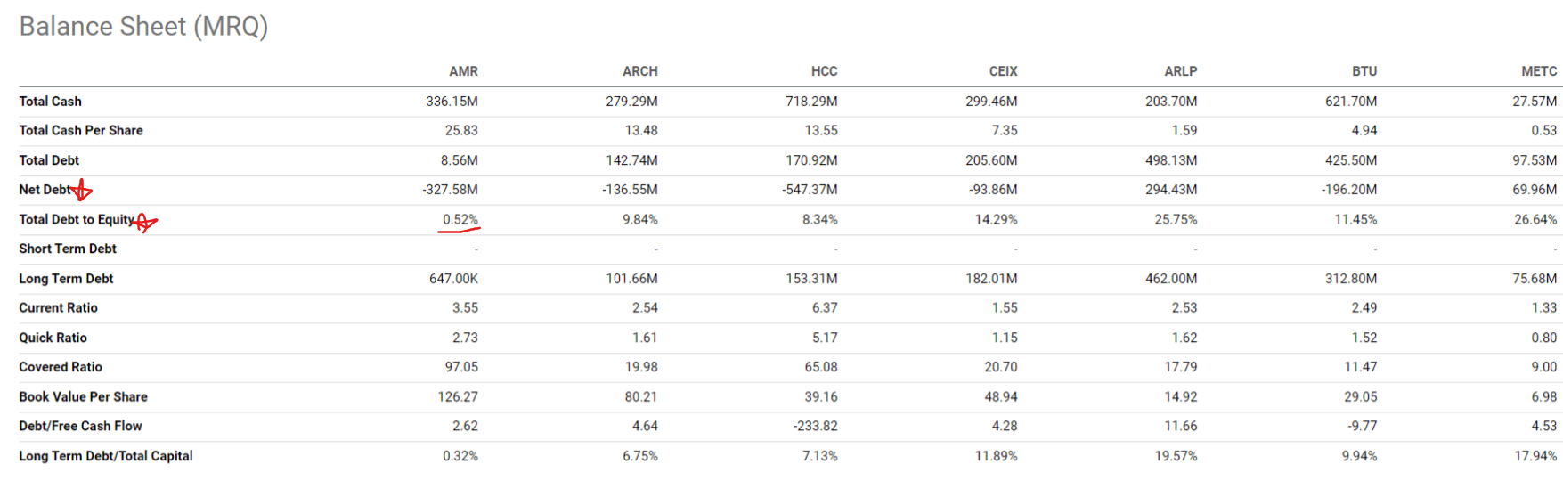 Third, AMR has a fortress Balance Sheet, with management prioritizing capital preservation and liquidity in this down market. Management and some members of the board understand what made companies go bankrupt back in 2015; being over levered after consolidation at the top of the market is what did them in. As you can see from the Comparison Tab on Seeking Alpha, I believe all coal miners remember that time period and most are well-prepared with negative net debt positions. AMR has a D/E ratio of just .52%! If AMR is able to survive until the next market upcycle (which is a high probability with no debt), I believe AMR will execute extremely well as in the past and reward their shareholders with repurchases and dividends.