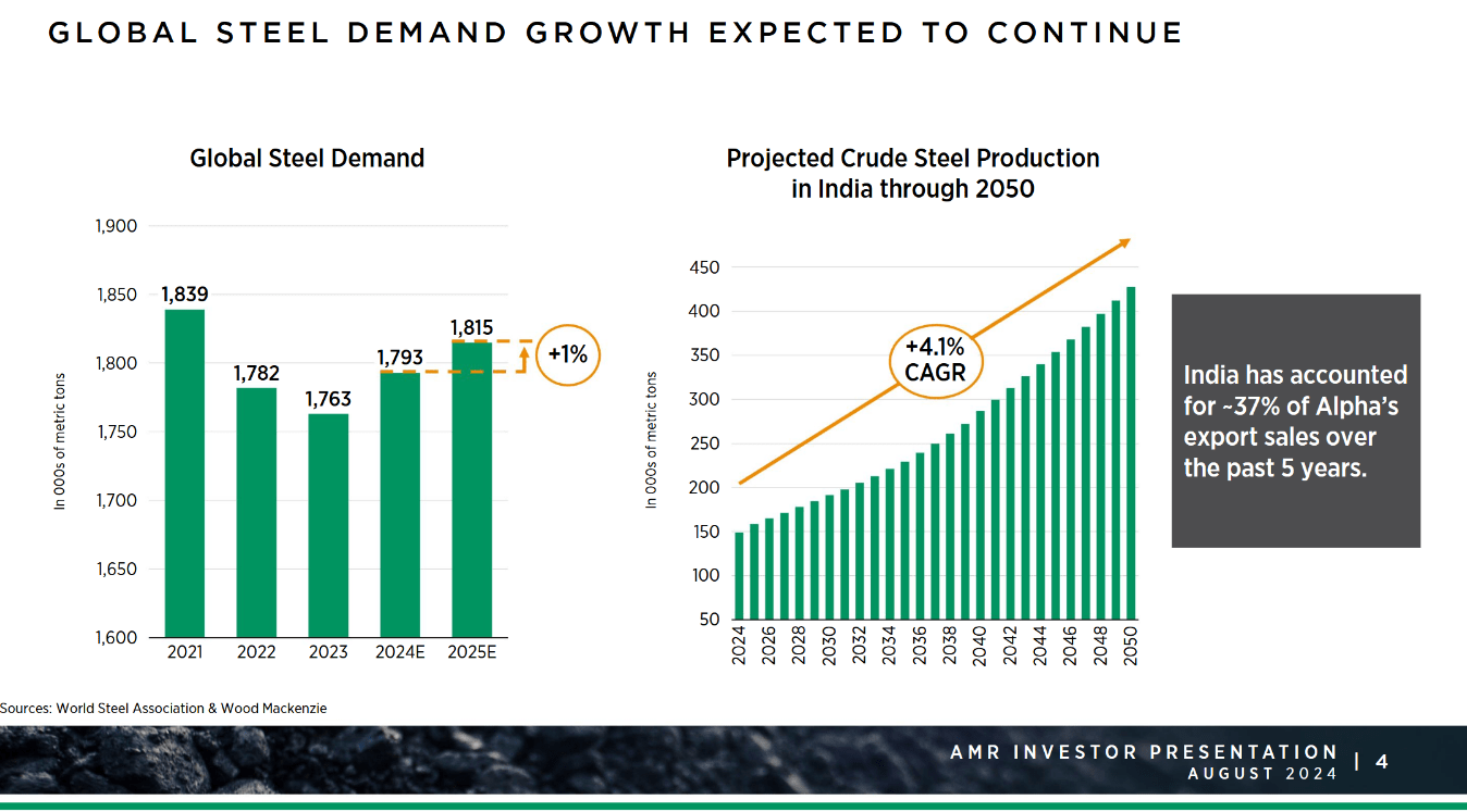Like all international commodity businesses, AMR does not have the ability to set their prices. Prices are determined by traders, coal quality, sales practices, and volume to an extent. However, the main driver of price is steel demand, which impacts global seaborne met indexes. According to the World Steel Association the best growth markets for steel demand are India and Southeast Asia. China is the largest producer of steel by far, with over 50% of global output.