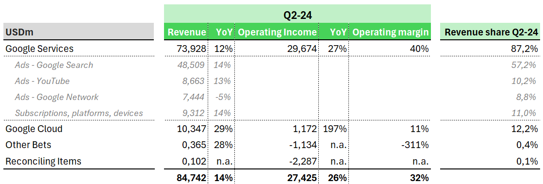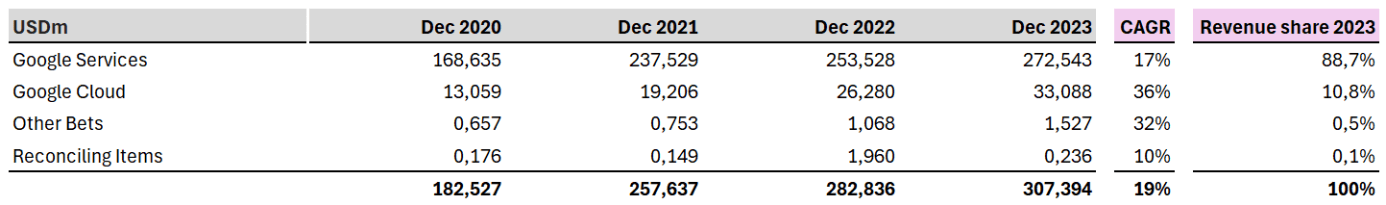 - Alphabet is becoming increasingly diversified, with the Cloud’s growing importance and profitability, while Google Services remain strong.
