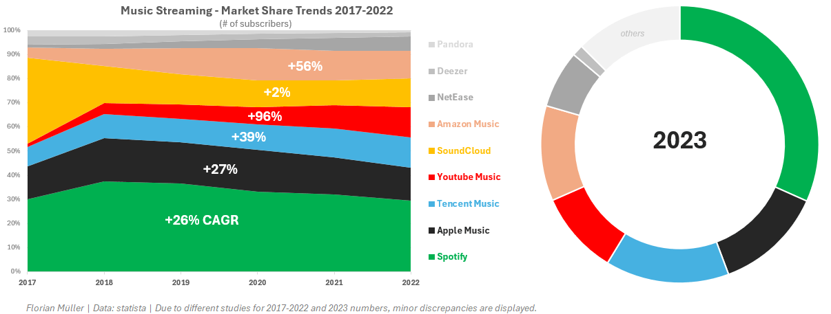 - YouTube Music was the fastest-growing music streaming service over five years until 2022, outpacing market leaders like Spotify, Apple Music, and Tencent Music. I discovered this in my Spotify analysis.
