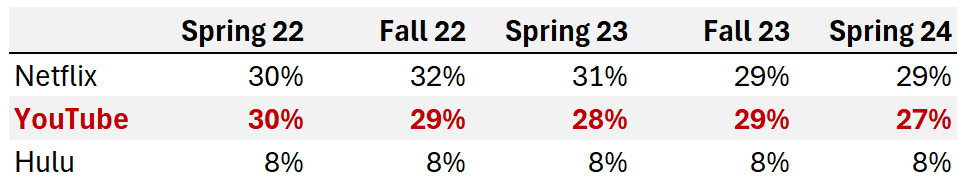 - Or in another context: YouTube in its Premium version is even a relevant player in video streaming. While the market is dominated by Netflix, Prime Video, and Disney+, according to Piper Sandler’s semiannual survey of U.S. teenagers, YouTube accounts for about a quarter of daily video consumption, almost on par with Netflix. The fact that YouTube Premium, now with well over 100 million paying subscribers, also holds a considerable position in this market was something I came across in my Disney analyses.