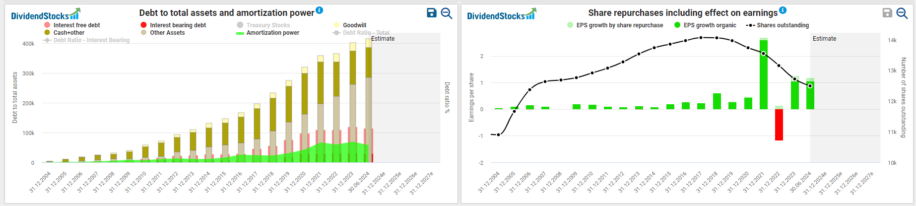 On average over the periods shown above, Alphabet already indirectly returned 60% of its operating cash flows, or 88% of its free cash flows, to its shareholders – mainly through share buybacks. However, the shift towards an additional dividend has already begun recently. On average, Alphabet has reinvested 32% of its operating cash flow in the form of CAPEX. This share has recently increased significantly to over 42% due to AI investments. The risk of investing too little in AI is greater than the risk of investing too much. I agree with this, even though it impacts free cash flows. If successful, Alphabet will secure its leading tech position with AI. If AI expectations are overstated, Alphabet can quickly reduce the CAPEX share, leaving more FCF for shareholders. I therefore see Alphabet in a comfortable position in this regard.