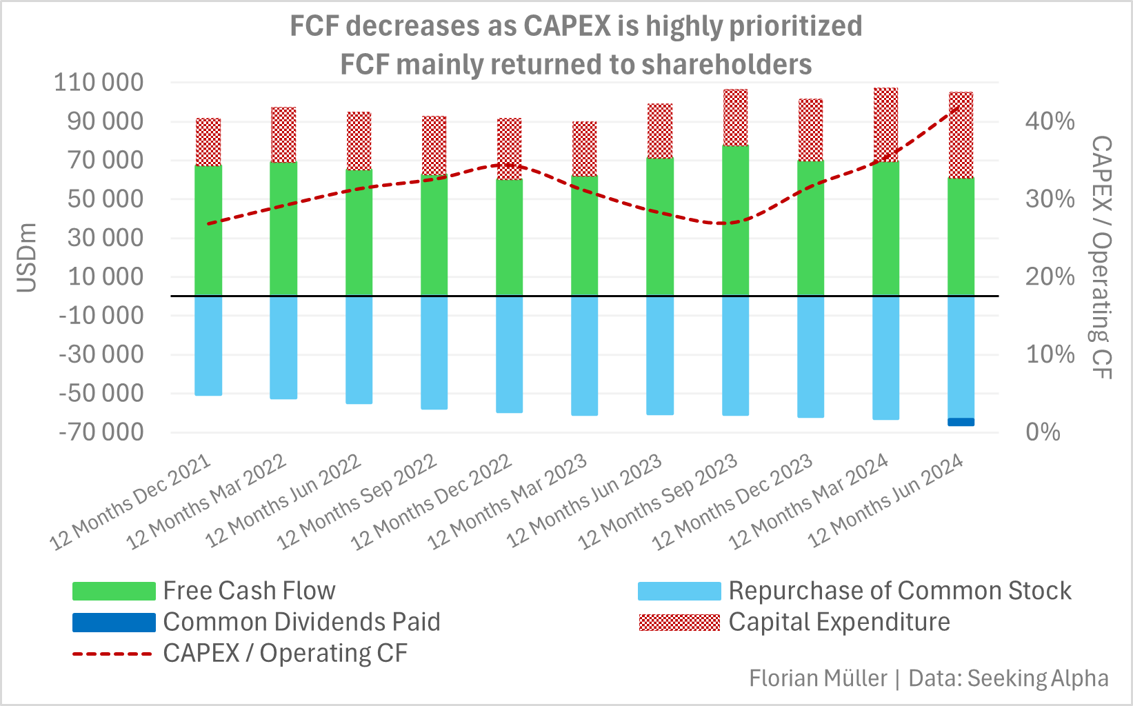 See below an overview of Alphabet’s cash flow statement using data from Seeking Alpha on a quarterly TTM basis. I argue that, even if it is hardly visible yet, due to the law of large numbers, Alphabet will eventually mature to significantly lower growth rates. But that is not a problem at all. Mature companies typically return more cash to shareholders. With the shift in the narrative from Alphabet being a growth story to becoming a future steady-state blue chip, the narrative could evolve more towards Alphabet as an income investment. In that case, I expect generous dividends from Alphabet, as is common for companies when excess cash can no longer be effectively reinvested for growth within the company.