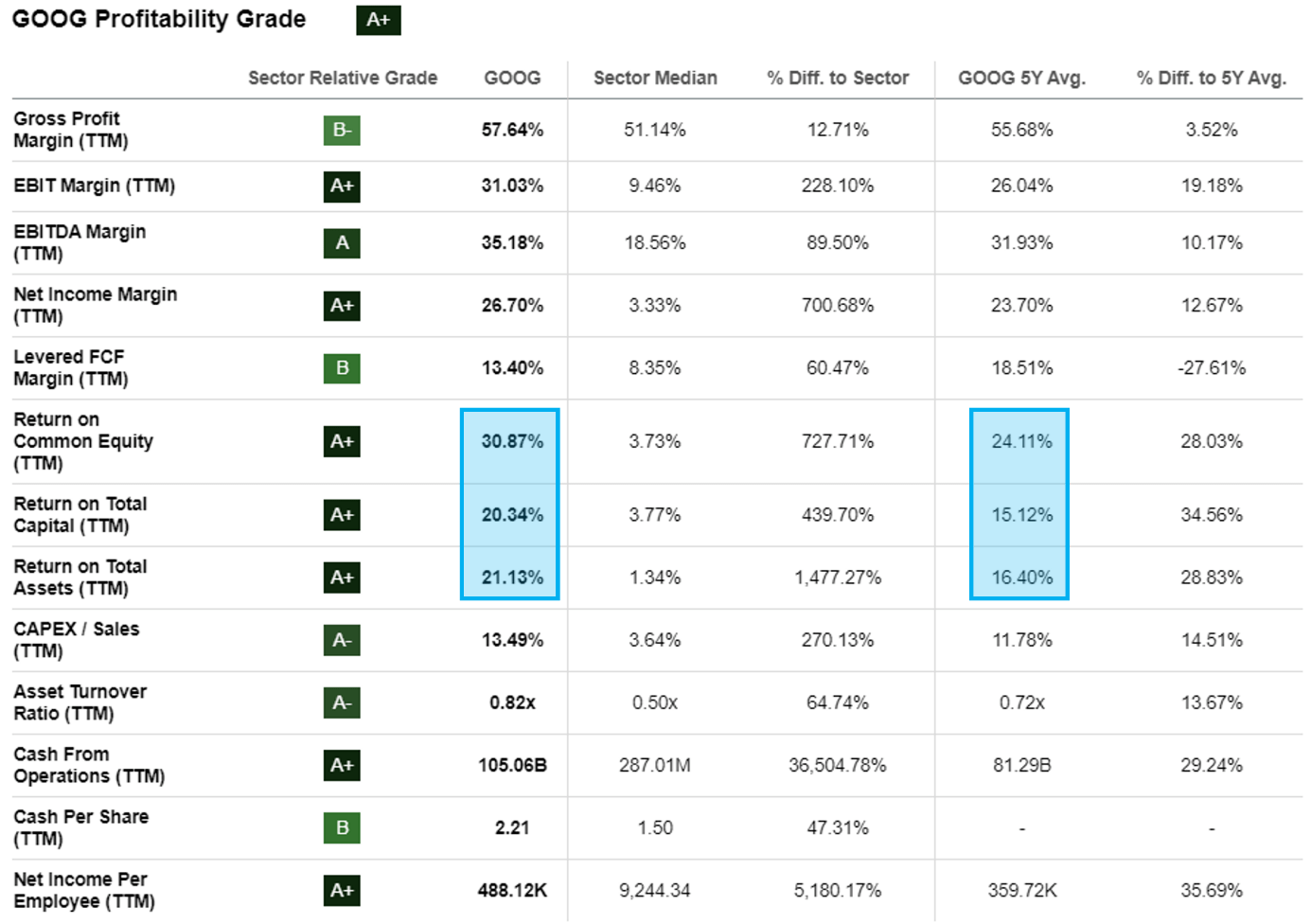 What investors also fear is that the intensive asset buildup for AI might erode profitability on the invested capital if additional AI returns fall short of expectations. Only time will tell, but for now, everything is in a very healthy range, as indicated by Seeking Alpha’s A+ profitability score. Profitability on capital is even well above its five-year averages.
