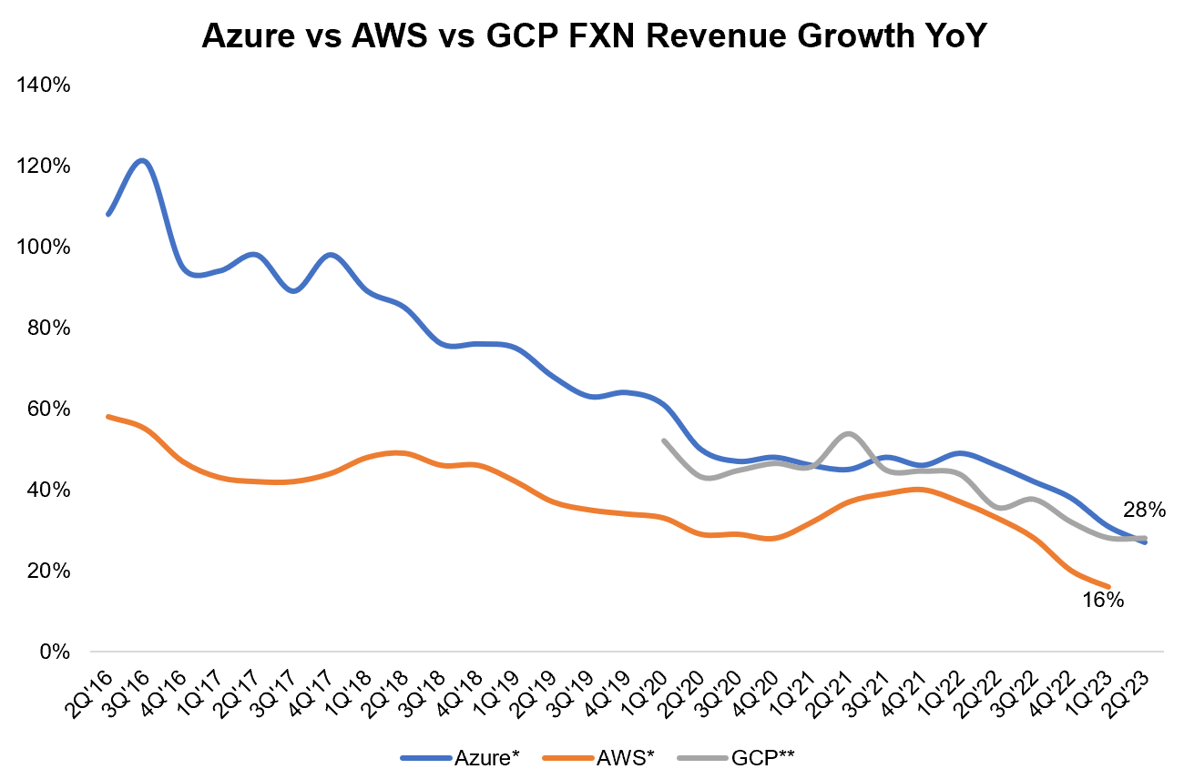 Azure reported 27% FXN growth this quarter; Google Cloud (which includes GCP and Google Workspace) was slightly better at 28% (not FXN though). But since management mentioned GCP outpaced overall Google Cloud growth again, we can probably infer GCP is growing faster than Azure. We’ll need to wait for Amazon’s (AMZN) earnings next week to see AWS topline growth.