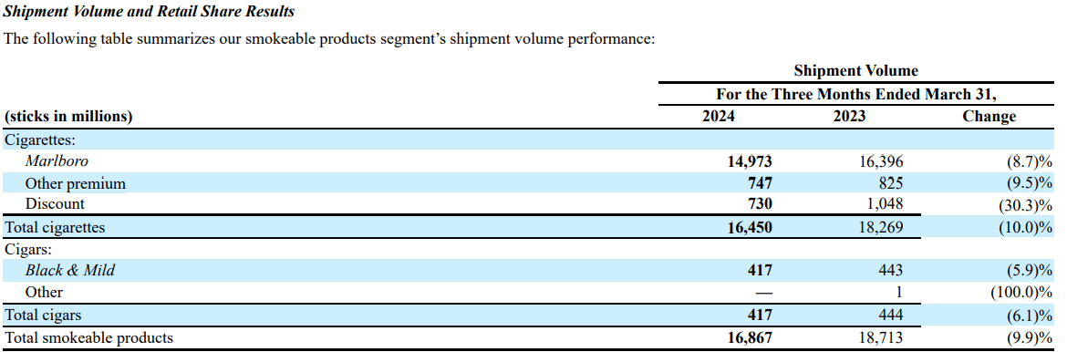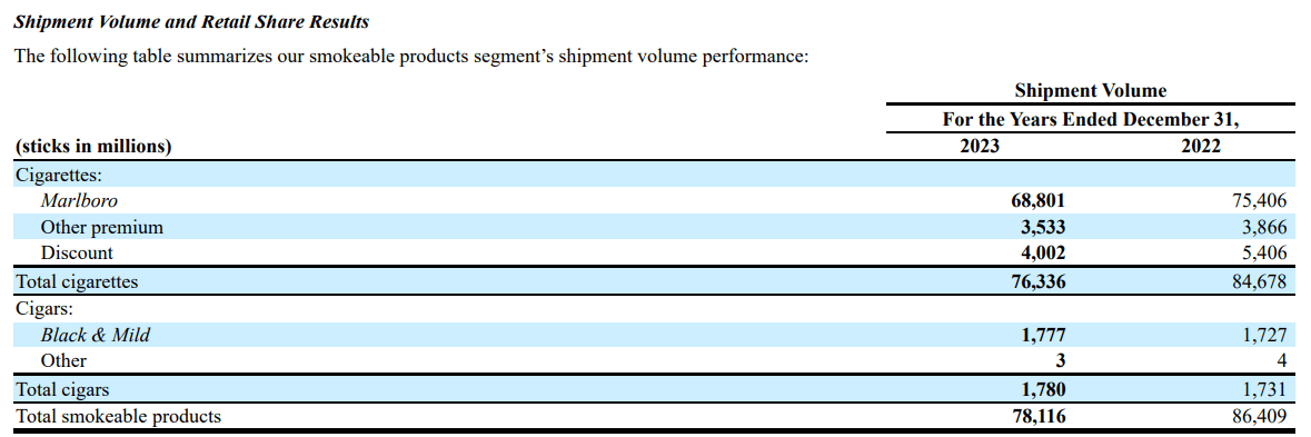 Whilst over the past several years Altria’s shipment volumes have been declining at a rate which could be offset by price hikes, in 2023, total shipment volumes of smokeable products declined by nearly 10% from the previous year, a decline large enough that price increases were unable to stabilize revenues.