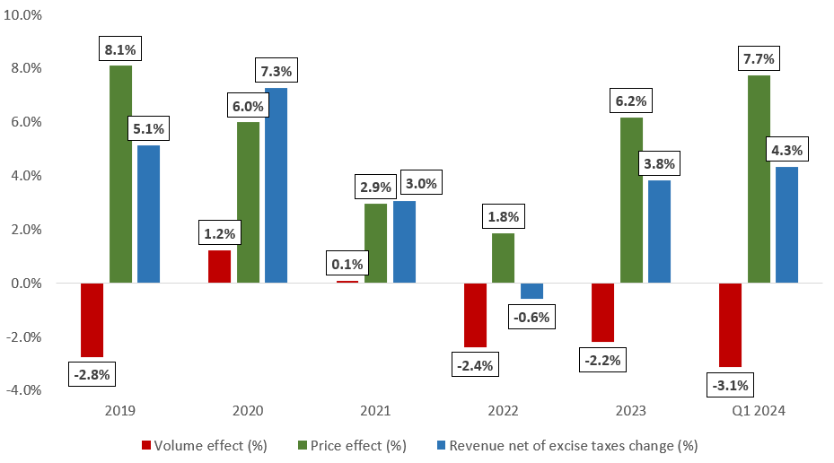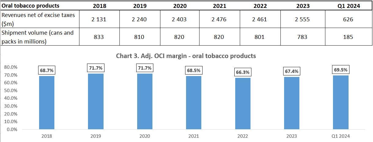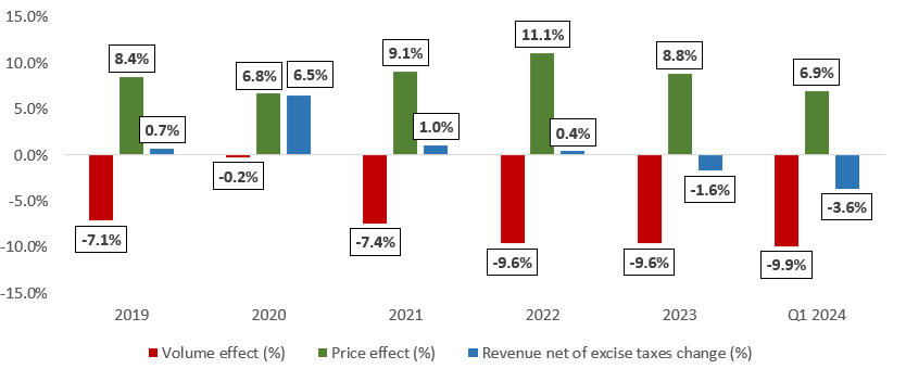 The Company upholds a substantial pricing power within the oral tobacco segment, which ensured revenue growth (net of excise taxes) during almost every year (excl. 2022) of the 2019 – 2023 period, despite generally negative volume effects (especially during the 2022 – Q1 2024 period). Please review the details on the chart below with analogous marking of data.