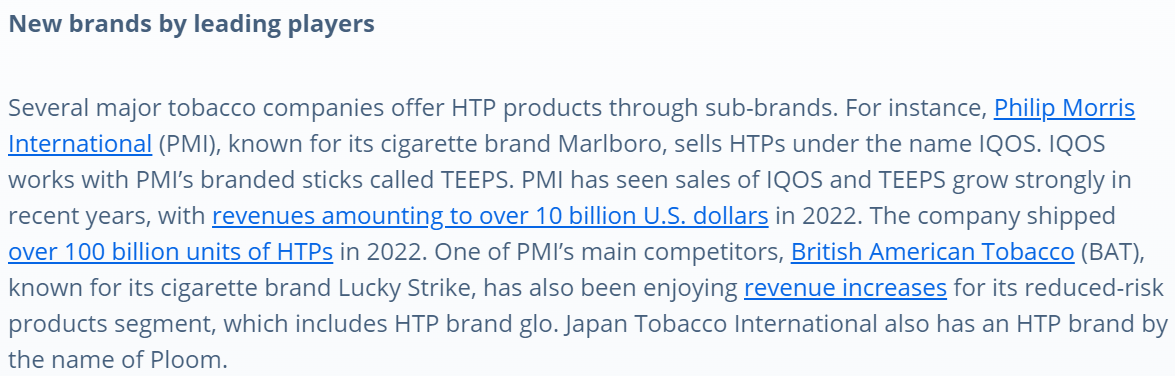 - However, the alternative product segments also face some headwinds (NJOY), or MO is yet to launch its first products (heated tobacco sticks).