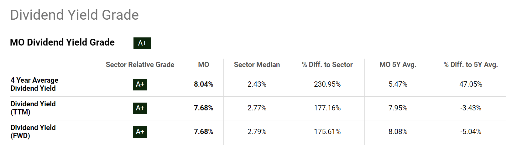 A discussion on MO won’t be complete without mentioning its dividend yield, which is another key upside risk and substantial downside protection in the case of a recession. To wit, the chart below shows MO’s dividend yield compared to its historical average and also sector median. As seen, MO has an overall A+ dividend yield grade, indicating an exceptionally attractive yield. Indeed, its current dividend yield (TTM) of 7.68% is very high either in absolute or relative terms. Moreover, the dividend yield still understates its attractiveness by ignoring share repurchases and debt paydowns (the focus of my last article).