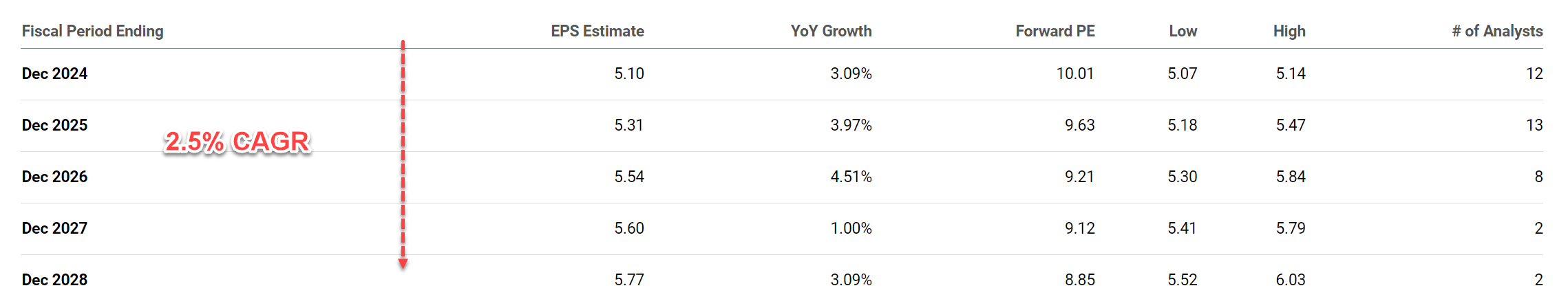 Overall, the company reported a solid quarter in my view. EPS from Q2 (on a non-GAAP basis) dialed in at $1.31 and narrowly missed market expectations (by $0.03, or about 2%). Revenue totaled $5.28B and also narrowly missed market expectations (by $110M, or also about 2%). Looking ahead, the company narrowed its 2024 full-year guidance range. The updated guidance now points to an adjusted and diluted EPS between a range of $5.07 to $5.15. To better contextualize things, consensus expects an EPS of $5.10, and the updated range translates into an annual growth rate between 2.5% to 4.0% from a base of $4.95 in 2023. Looking further out, the market consensus also expects an annual growth rate in the lower single-digits for the next few years (more on this later).
