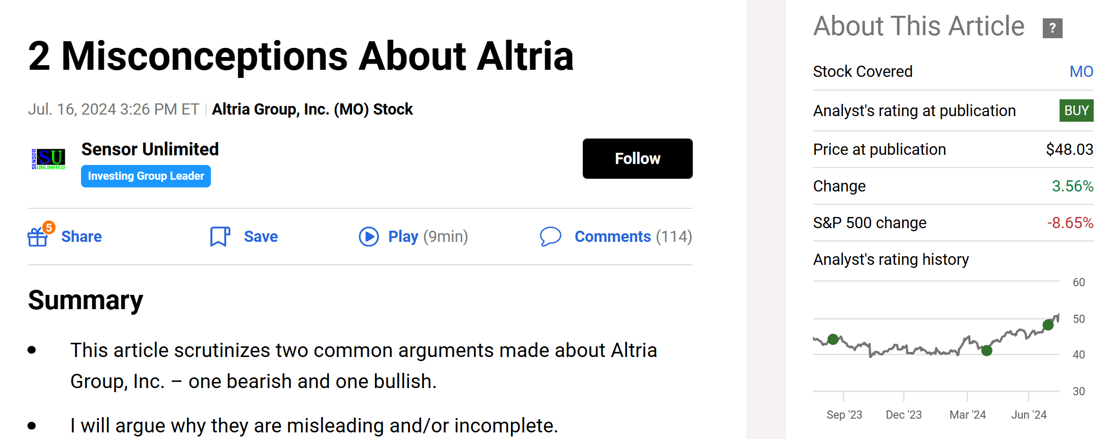 I last analyzed Altria Group (NYSE:MO) in mid-July. As you can see from the screenshot below, I wrote an article titled “2 Misconceptions About Altria” on July 16, 2024, on MO stock. As the title suggests, the goal of the article was to clarify two common misconceptions surrounding the stock, and I argued why the stock’s upside potential is underestimated because of these misconceptions. More specifically, I explained why: