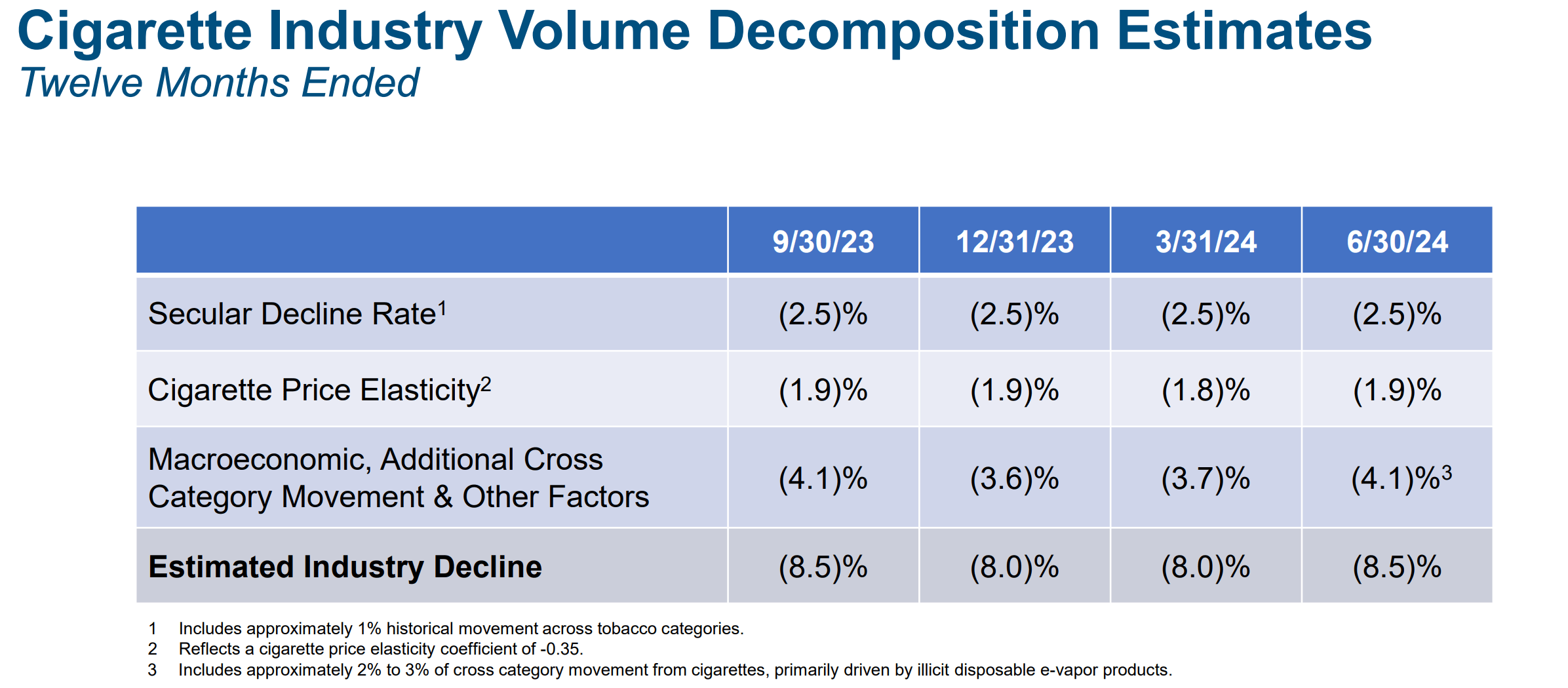 With these new developments, it is therefore the goal of this article to provide an updated analysis of the stock. In this follow-up article, I will switch my focus from the long-term view in my previous article and focus on the immediate term. In the remainder of this article, I will A) review the key catalysts and risks from its Q2 ER, and B) explain why the stock is a very timely hedge against a potential recession judging by sales data (especially Cigarette Price Elasticity data) of its recent products.