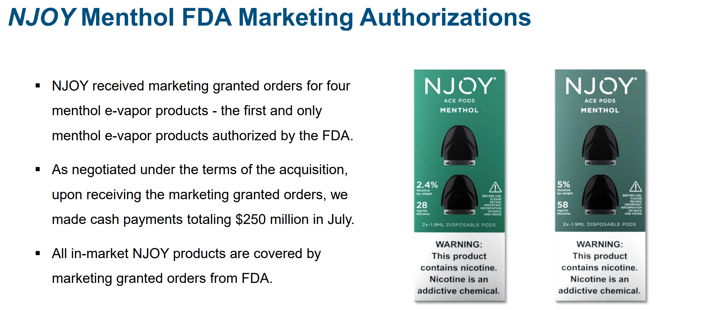 Diving into the numbers further, smokeable products kept their decline. Shipment volume declined 11.8% YOY. Better pricing partially offset the volume decline and segment revenues decline “only” 4% YOY. The impacts from the smokeable volume were further softened by the new products. In particular, the on! franchise was a key driver and maintained its growth momentum in Q2. Other key developments include the marketing authorizations NJOY received from the FDA (see the slide below). Four of MO’s NJOY e-vapor products are covered by the authorization (the first and only menthol e-vapor products authorized by the FDA), paying the way for further market penetration and growth.