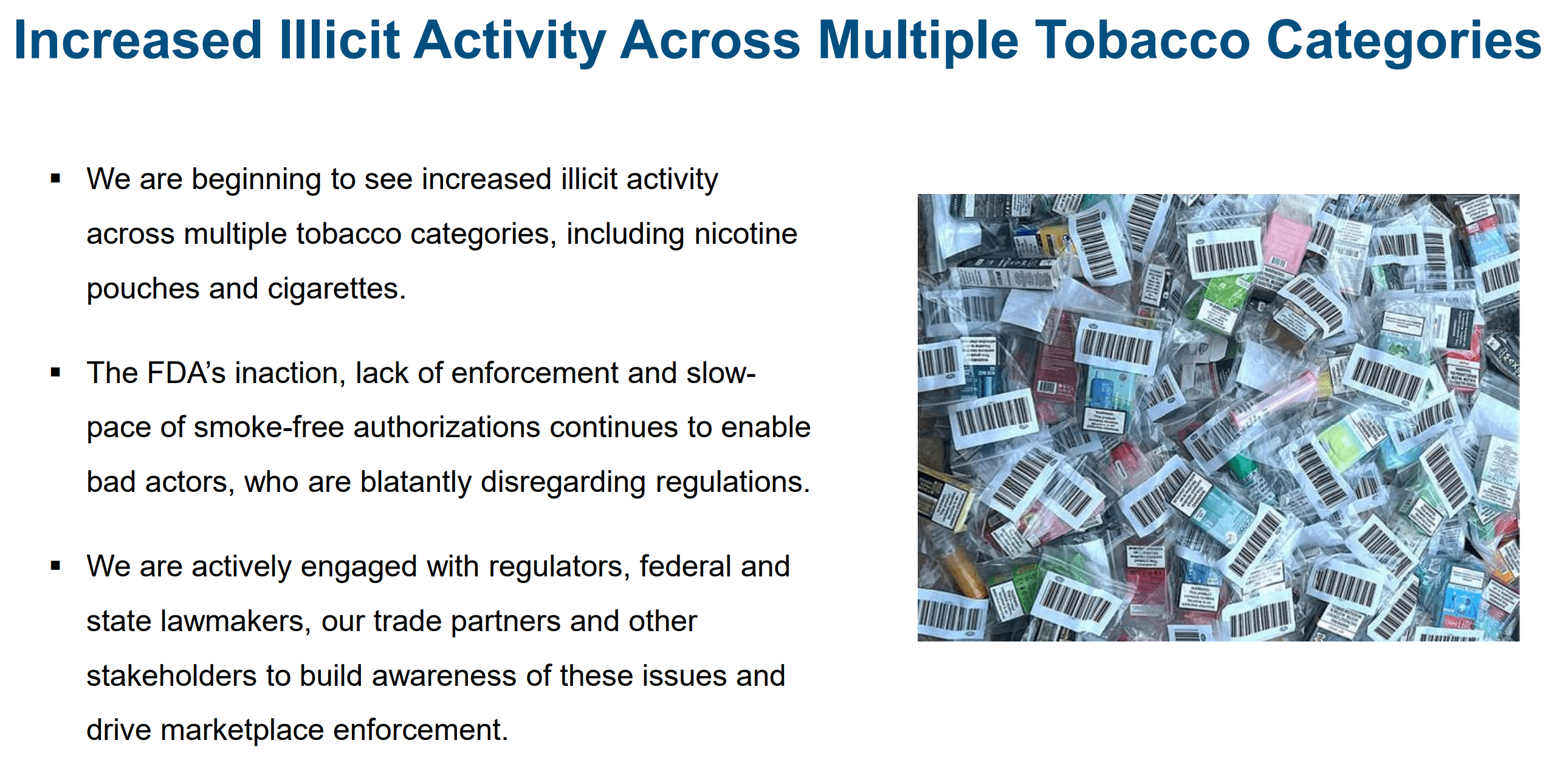 We are beginning to see increased illicit activity across multiple tobacco categories, including nicotine pouches and cigarettes. The FDA’s inaction, lack of enforcement and slow pace of smoke-free authorizations continue to enable bad actors, who are blatantly disregarding regulations.