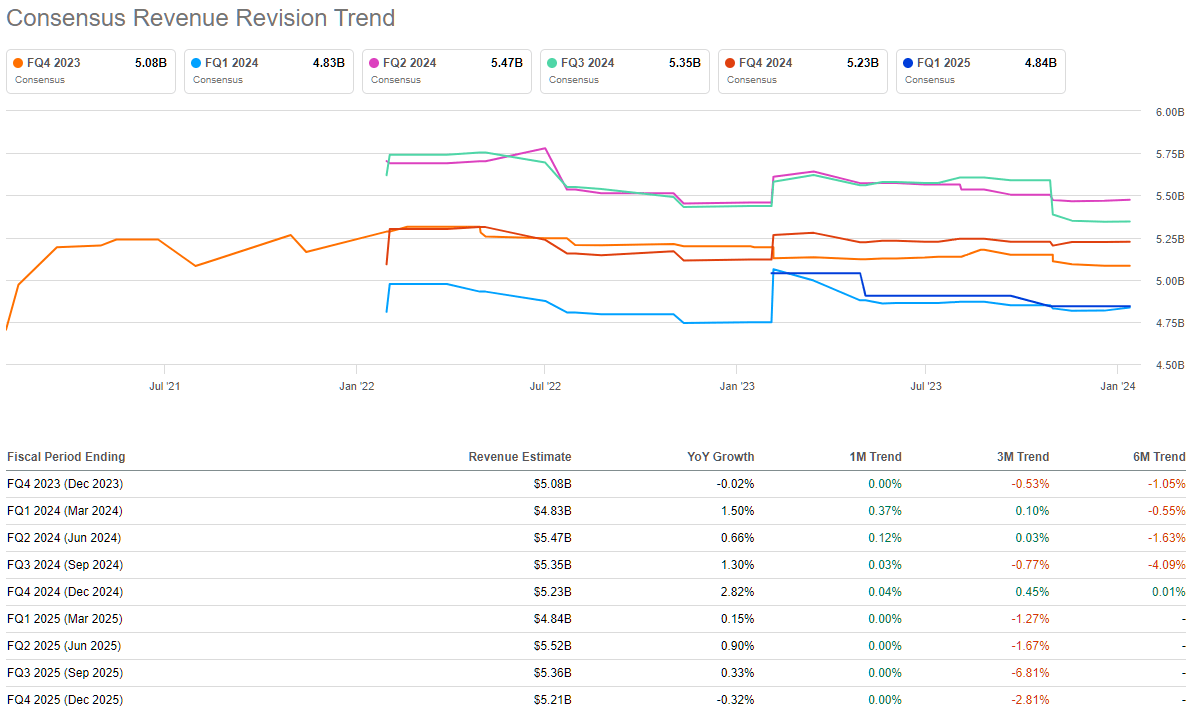 Analysts currently expect adjusted earnings per share (EPS) of $1.18 for the fourth quarter, so basically flat year-over-year. Net sales are also expected to remain largely unchanged at around $5.08 billion. For the full year, earnings per share are expected to be $4.96 (+2.5% year-over-year) and net sales are expected to come in at $20.56 billion (-0.6% year-over-year). Revisions to EPS and net sales estimates have been insignificant in recent months (Figure 1 and Figure 2, respectively), once again confirming the predictability of the business and the reliability of management’s guidance.