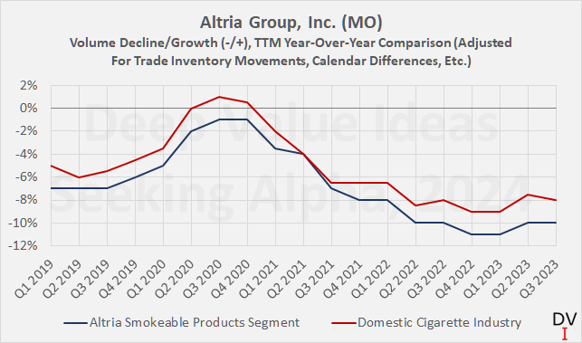Figure 6: Altria Group, Inc. (MO): Smokeable Products segment growth/decline on a quarterly basis, compared to the domestic cigarette industry trend (own work, based on company filings)