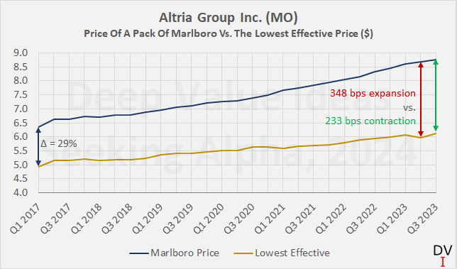 Figure 9: Altria Group, Inc. (MO): Spread between the price of a pack of Marlboro and the lowest effective price in absolute and relative terms (own work, based on company filings)