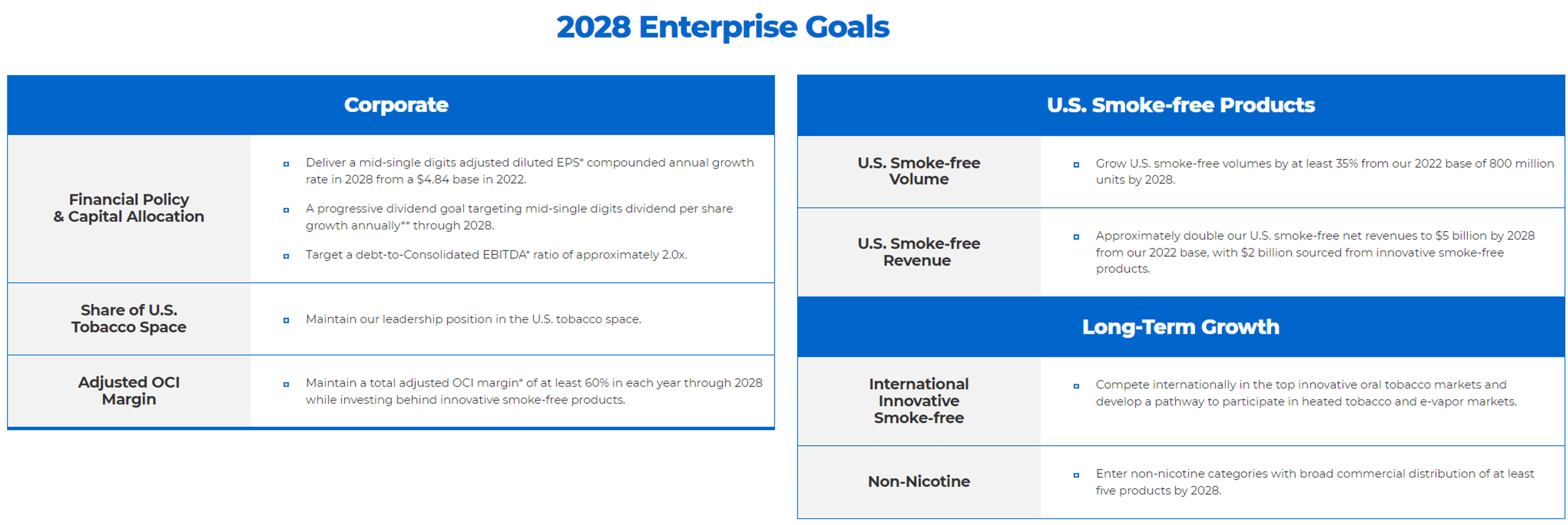 • MO’s prospects are also significantly aided by the promising Vision and 2028 Enterprise Goals, funded through $600M in cumulative cost savings from the Optimize & Accelerate initiative.