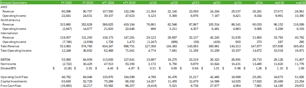 In terms of growing capacity, Amazon invested $17.62b in Q2 ’24, which was primarily allocated to AWS-related infrastructure to serve the strong demand for both GenAI and non-GenAI workloads. Though management did not provide firm figures for Q3 ’24, they noted that capital investments will grow sequentially with the objective of building out AWS capacity. I’m forecasting capital investments for Q3 ’24 to sum to $20.5b and $75b for all of eFY24 as the firm catches up with customer demand to support cloud-based workloads.