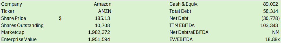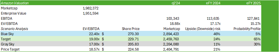 Given the long runway for growth in AWS paired with strength in advertising, Amazon’s growth will likely push through the potential headwinds posed by the challenged consumer. Despite the relatively challenged price action for AMZN shares post-Q2 ’24 earnings, I believe AMZN shares will remain resilient as the firm continues to invest in AWS, leading to strong cash flow generation. Using an internal valuation model based on my eFY25 EBITDA forecast and the ticker’s historical valuation range, I believe shares should be priced at $224/share at 18.57x eFY25 EV/EBITDA, providing investors a potential upside risk of 21% from today’s trading range. I recommend AMZN shares with a BUY rating.