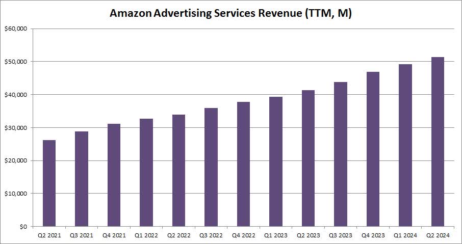 AWS should surpass $100 billion in trailing twelve-month revenue sometime in the back half of this year, and the segment is now a profit monster. Operating income was over $9.3 billion in Q2 2024, up 74% over the year ago period. Additionally, as the chart below shows, Amazon’s advertising services business has become a more than $50 billion a year revenue giant.