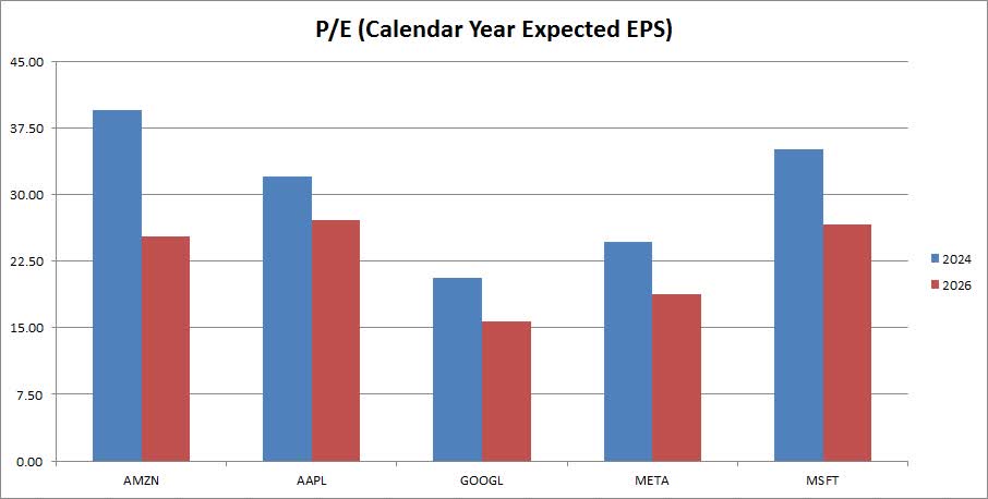 For a number of years, Amazon’s price-to-earnings ratio was sky-high, or even non-existent, due to low net income or even losses. Now that the company has started to generate reasonable profits, the valuation on this basis looks a lot more reasonable. In the chart below, I’ve compared the name to five other tech giants – Apple Inc. (AAPL), Alphabet Inc. (GOOG) (GOOGL), Meta Platforms, Inc. (META), and Microsoft Corporation (MSFT). For each name, the valuation is based on analyst estimates for each name’s calendar year this year and in 2026, which makes the comparison between them equal since a couple of these names do not use calendar fiscal years.