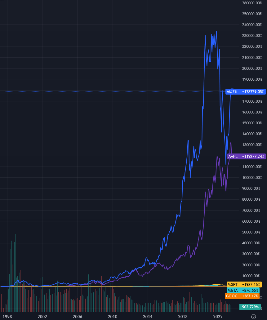 2023 is just one year among many, however. When we look at Amazon stock since its public listing in Q2 1997 we can see just how well it has performed over the years. Well outpacing all of the other largest technology companies on price return, Amazon stock has returned a staggering 178,729% since its public listing. An investment of $10,000 held to date (25 years) is now worth $17,872,900. For buy and hold investors that’s about as good as it gets.
