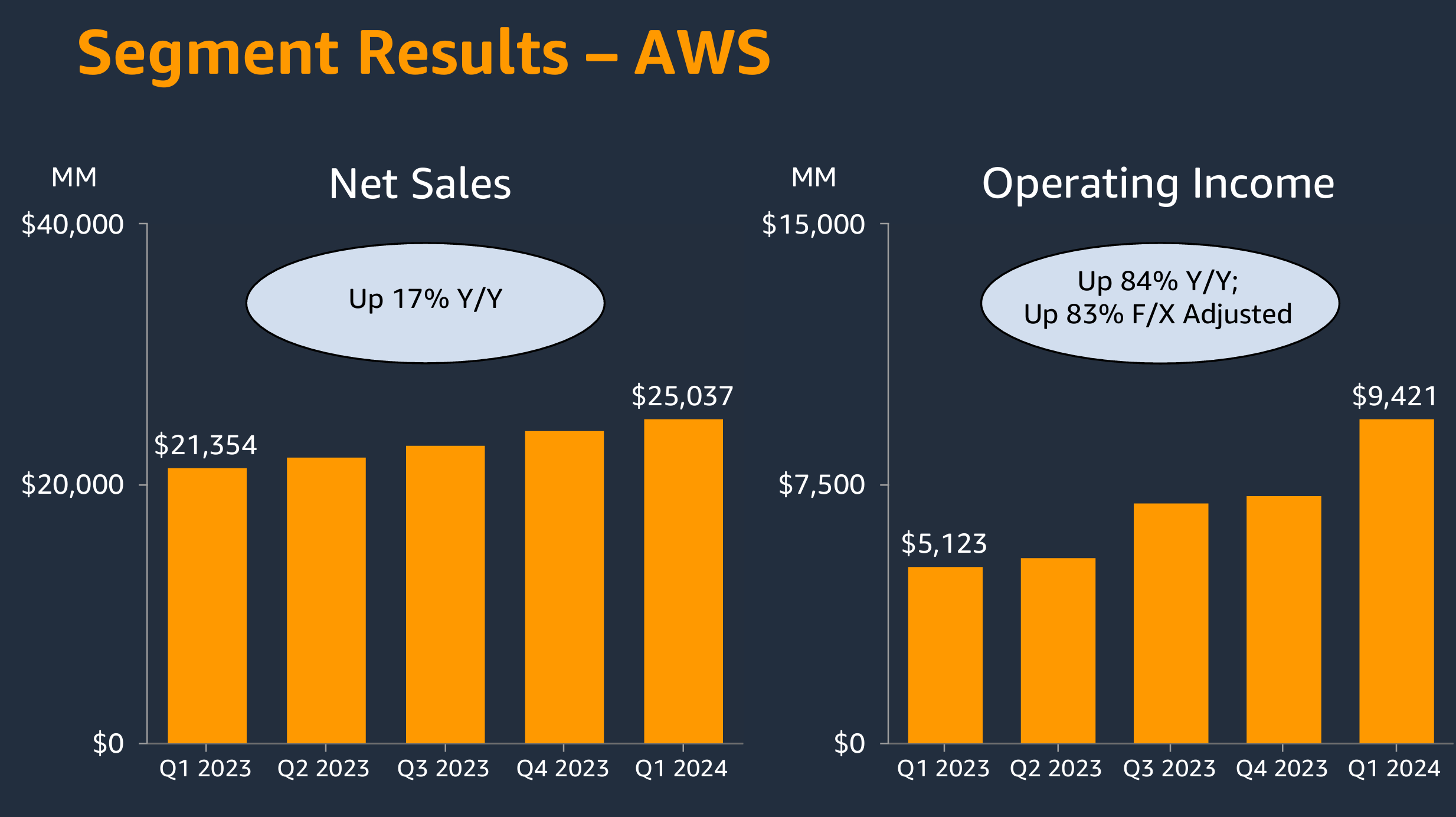 AWS operating margins came in at 37.6%, higher than consensus of 32.5%. On an absolute basis, operating income grew 83% on a constant currency basis from the prior year to $9.4 billion, up $4.3 billion from the prior year.
