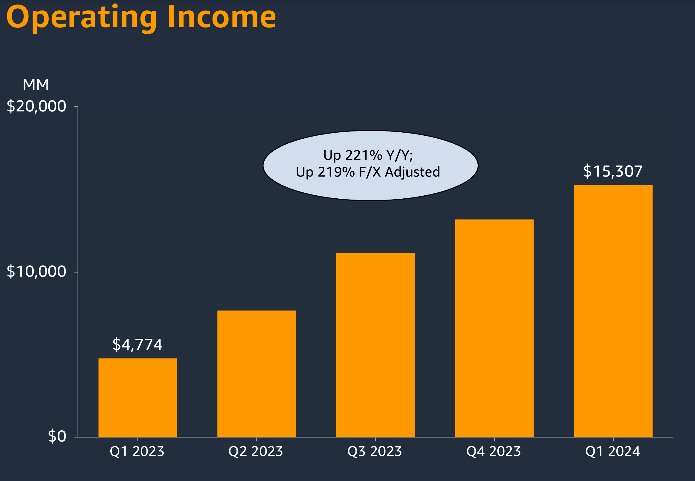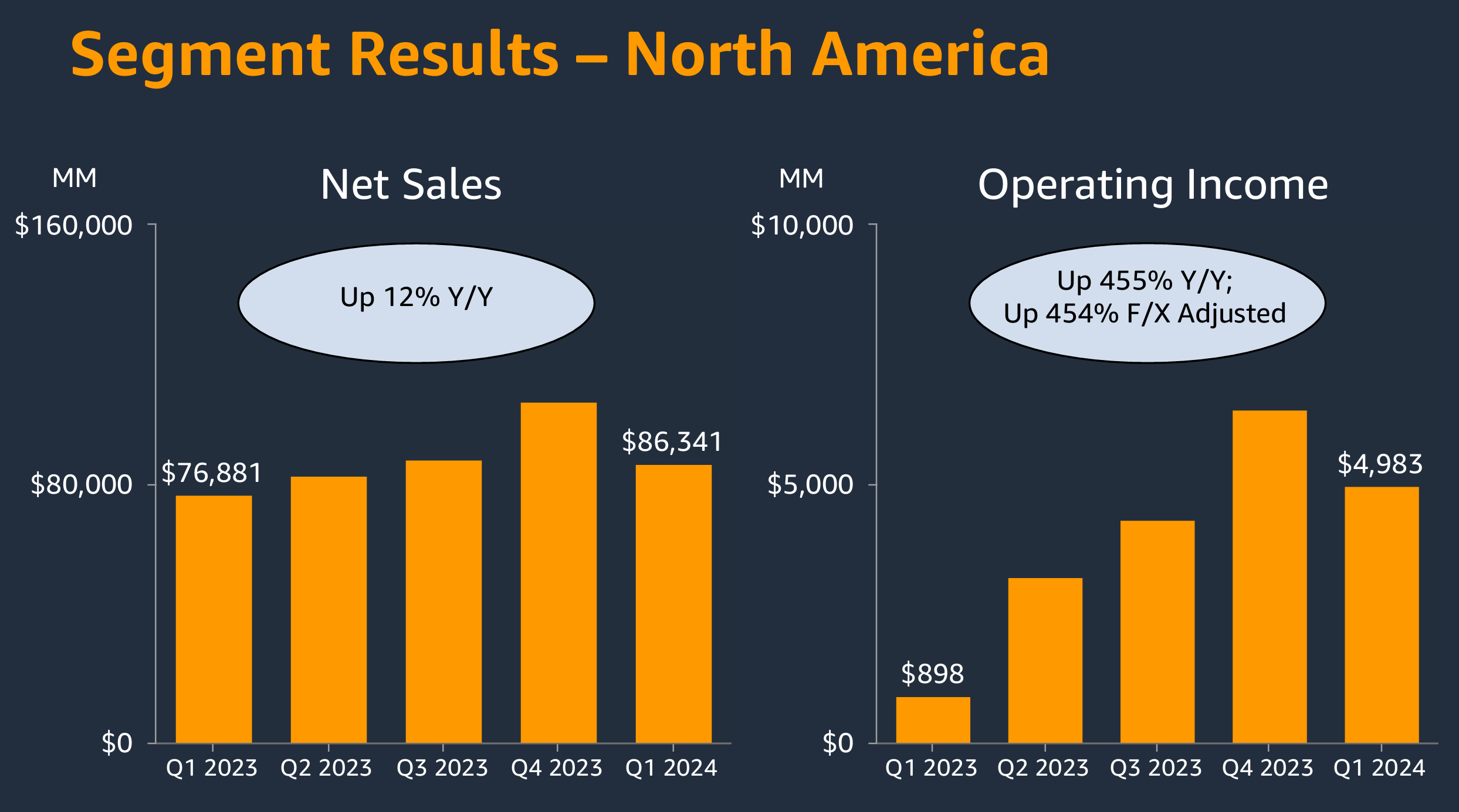 This was largely due to operating income for the North America Retail segment coming in at $5 billion or 5.8% margin, growing by more than $4 billion this quarter, and the AWS segment growing operating income by $4.3 billion from the prior quarter.