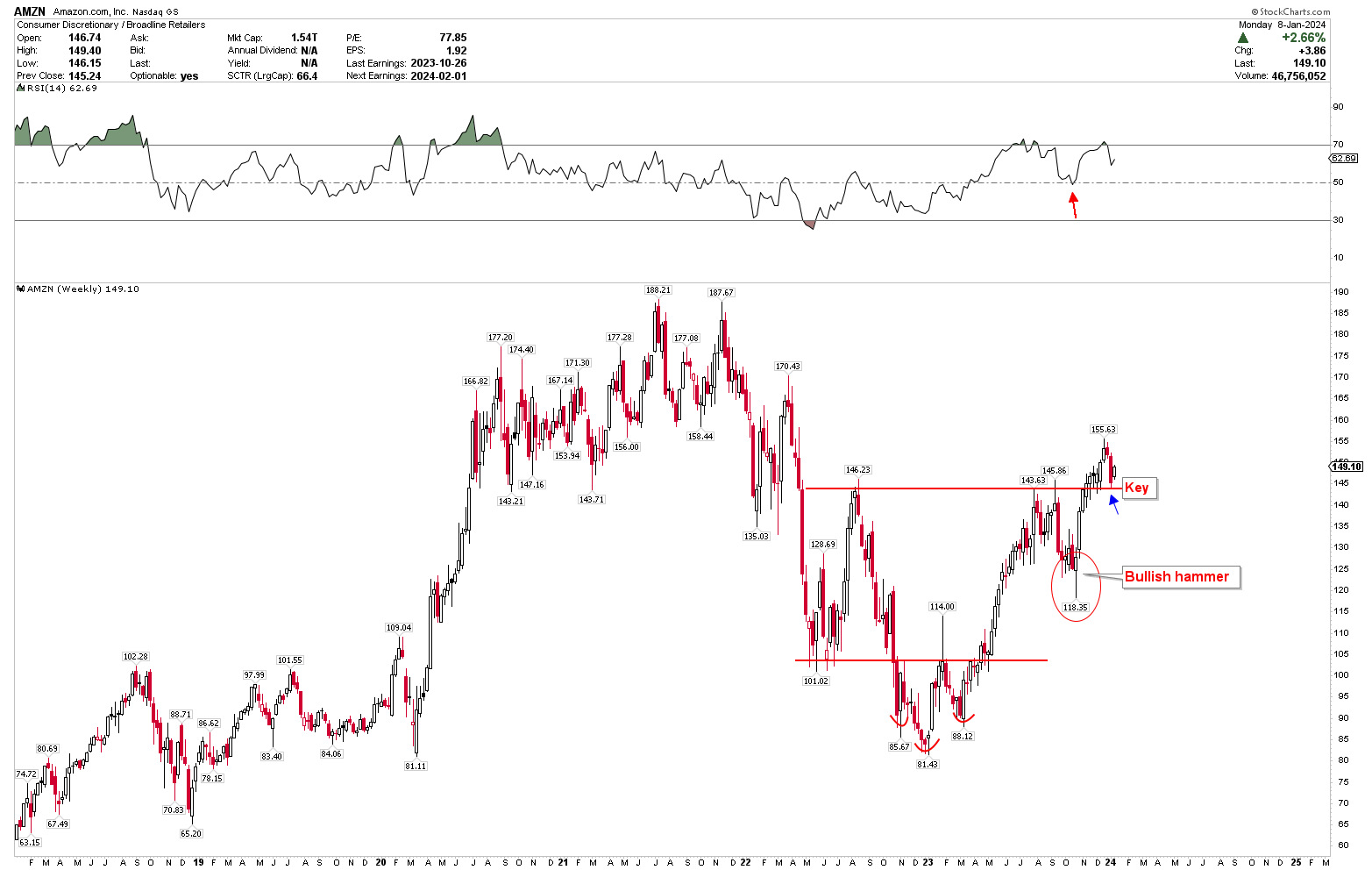 The analysis suggests that Amazon’s stock price is poised for a significant upward trend and could reach new highs in 2024. The weekly chart reveals a short-term bullish pattern, offering insights into potential investment opportunities. Notably, the stock presents a bullish hammer on the weekly chart, mirroring a similar pattern observed on the monthly chart. This bullish hammer has sparked a new rally, as evidenced by consistent strong closes in the weekly charts. Forming an inverted head and shoulders pattern, with the head at $81.43 and shoulders at $85.67 and $88.12, has established a robust bullish price structure, signaling a solid rally into 2024. Furthermore, the appearance of the bullish hammer coincided with the RSI reaching a mid-level, reinforcing the bullish sentiment.