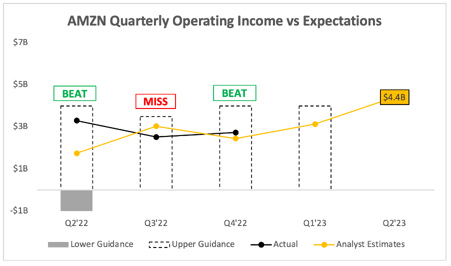 If we move down the income statement to operating income, analysts are expecting Amazon to deliver EBIT of $3.14B, representing an EBIT margin of 2.5%, and a 14% YoY decline from Q1’22. This once again falls slightly above the midpoint of management’s $0-$4B guidance offered in the prior quarter.