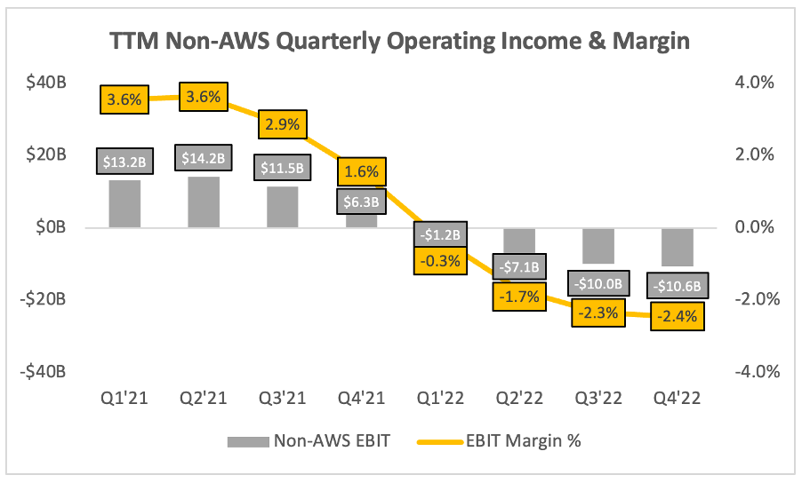 Amazon’s story over the past year or two has been all about how brilliant AWS has performed, delivering rapid growth and margin expansion that has helped to drive Amazon to new heights. This became even more apparent in 2022, as Amazon’s non-AWS business burned through cash and it was only the profits of AWS that kept Amazon in the green.