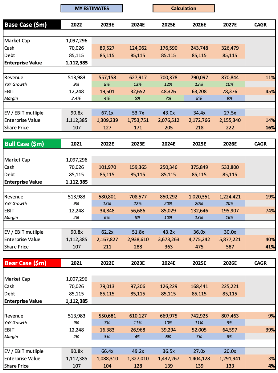 Overall, my assumptions for the valuation model have not changed much from my previous article. I still expect Amazon to grow at a decent pace through to 2027, and believe there is plenty of opportunity for the company to keep expanding margins as AWS becomes a bigger contributor to overall revenues and the rest of Amazon starts to shake off its pandemic-induced hangover.