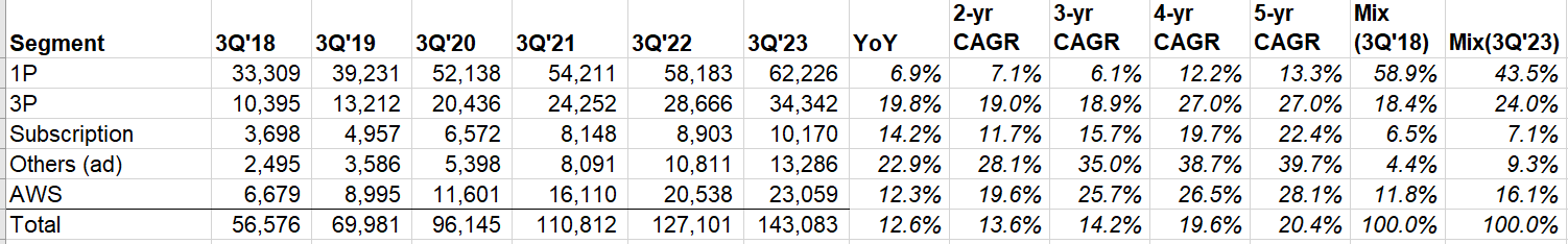 Imagine opening Amazon’s (NASDAQ:AMZN) 3Q’23 earnings report 5 years from now and what do you think you might hope you paid more attention to? It’s very unlikely to be AWS topline growth rate this (or any) quarter. If I have to guess, it’s the shipping+ fulfillment costs related developments that you would find more consequential 5 years from now.