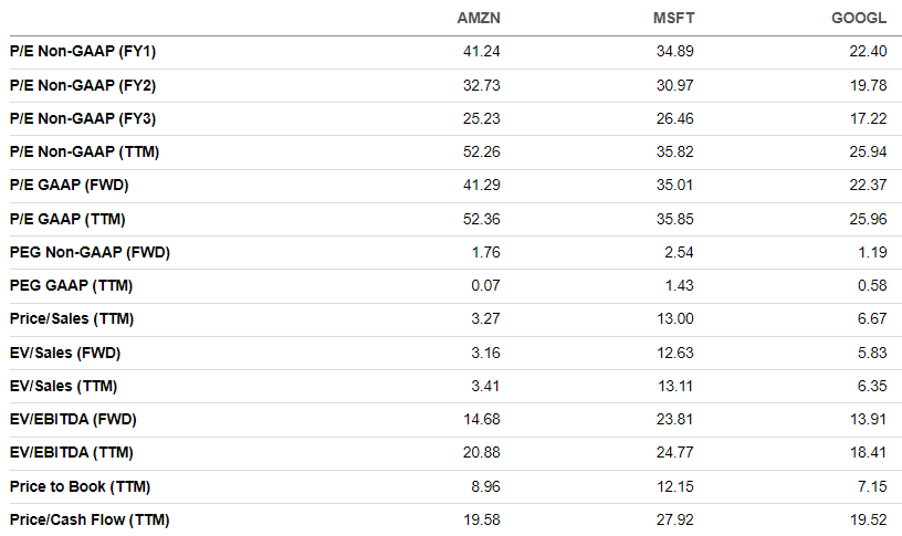It is quite difficult to conduct peer ratios analysis for Amazon because the company does not have peers. There is no other company that holds rock-solid leadership in two large and emerging industries. However, I can compare Amazon’s multiples with its closest rivals in cloud business: Microsoft (MSFT) and Google (GOOG)(GOOGL).