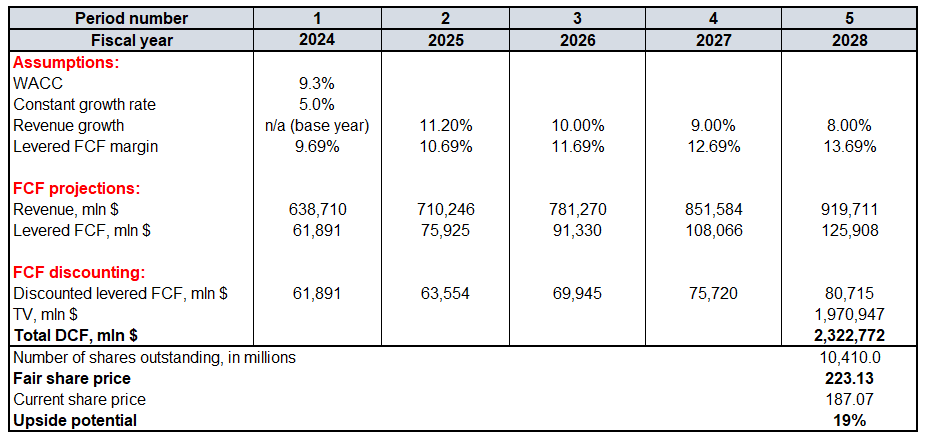 The fair share price is $223, according to my calculations. This is 19% higher than the current share price, indicating a compelling upside potential. The updated target price is higher than my earlier $208 estimate. The upgrade is explained by the notably improved TTM FCF margin, which also affected FCF projections for the years 2025-2028.