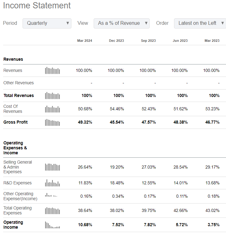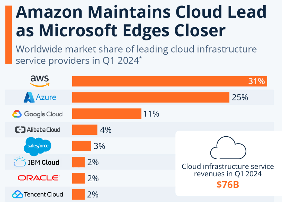 Microsoft and Google continue gaining market share in cloud, posing risks to AWS’s leadership. The risk is remote because the gap between AWS and Azure in terms of market share is still wide, six percentage points. However, the YoY dynamic indicates that competitors expanded their market shares and AWS shrank. In Q1 2023, Azure had a 23% and Google Cloud had a 10% market share, both lower compared to Q1 2024 (last quarter’s market shares of key vendors highlighted in a screenshot for my fundamental analysis). The changes are not dramatic and, but the trend indicates the fact that AWS faces fierce competition.