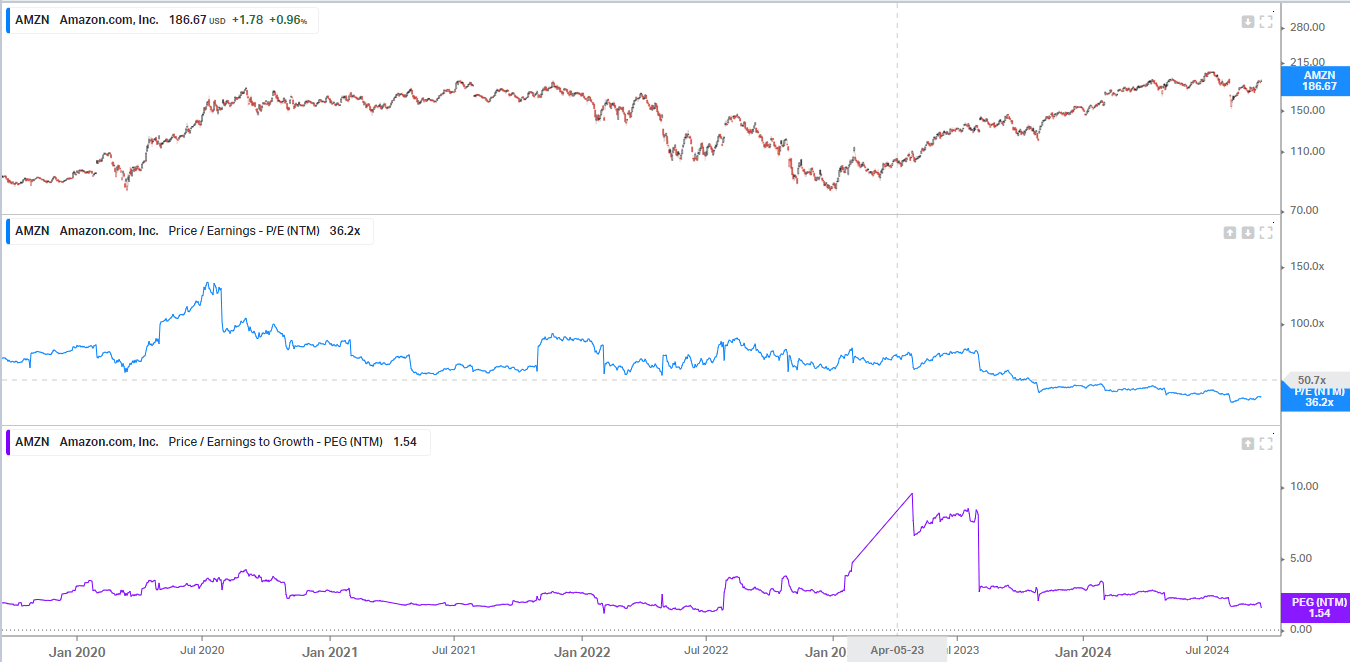 Another piece of information that caught my attention is the company’s valuation indicators. Given Amazon’s size and the many types of businesses it does, I believe it would be interesting to make a comparative assessment of the company against its own historical P/E and PEG, and we will do so below.