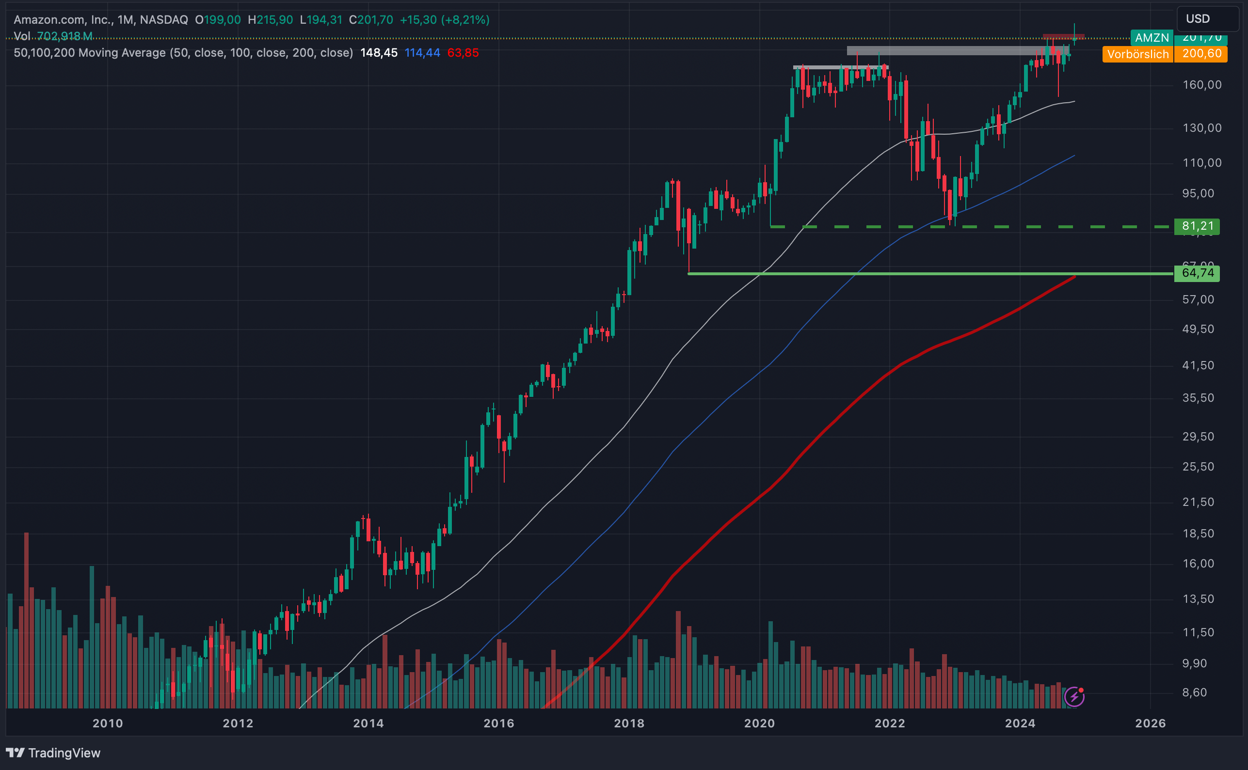 In case of Amazon there is another reason to remain cautious at this point – the monthly chart. When looking at the data, we see that Amazon was still not able to break out. While the S&P 500 is marching higher and higher and the Nasdaq-100 also exceeded its 2022 high, Amazon seems to be caught in a pattern that can be described as forming a market top. Since about four years, the stock is not really able to break above the highs of 2020 and 2021. The stock price is pushing against that resistance level but did not manage to go higher so far.