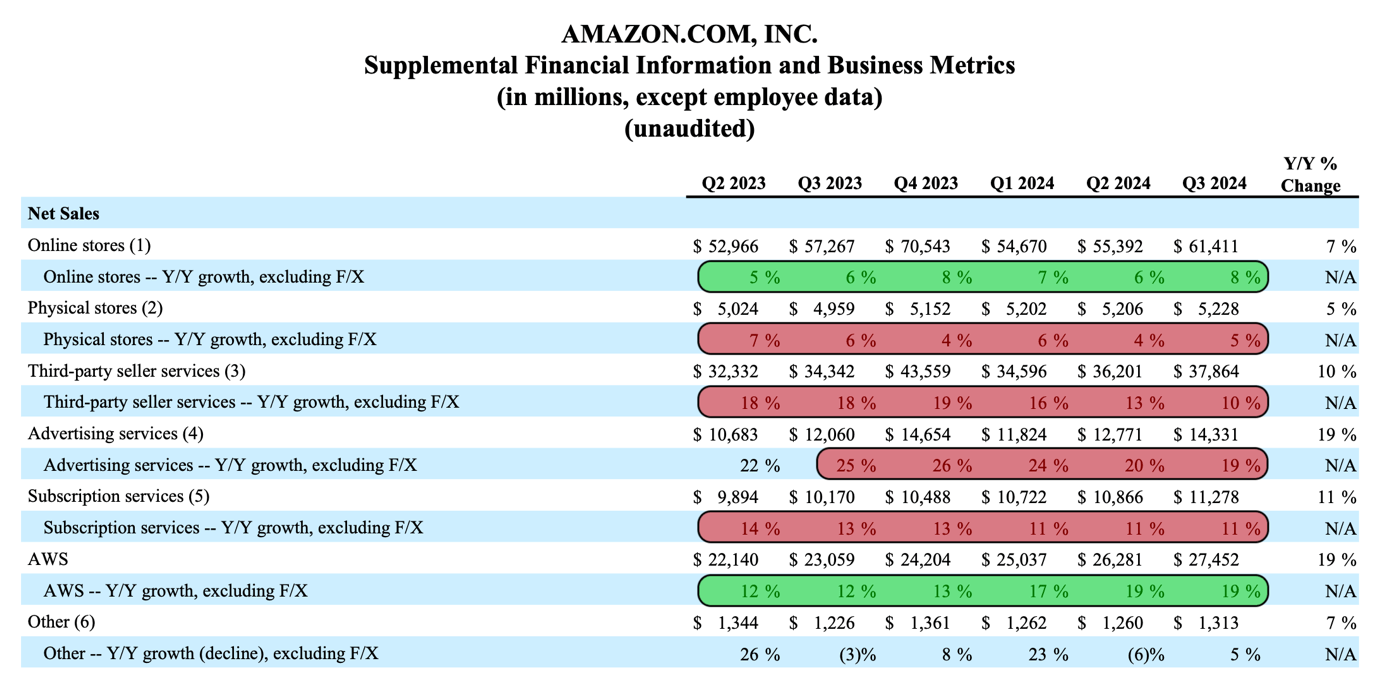 - Amazon’s Q3/24 results show impressive growth with 11% revenue increase and 52.1% EPS growth, yet some segments are seeing decelerating growth rates.