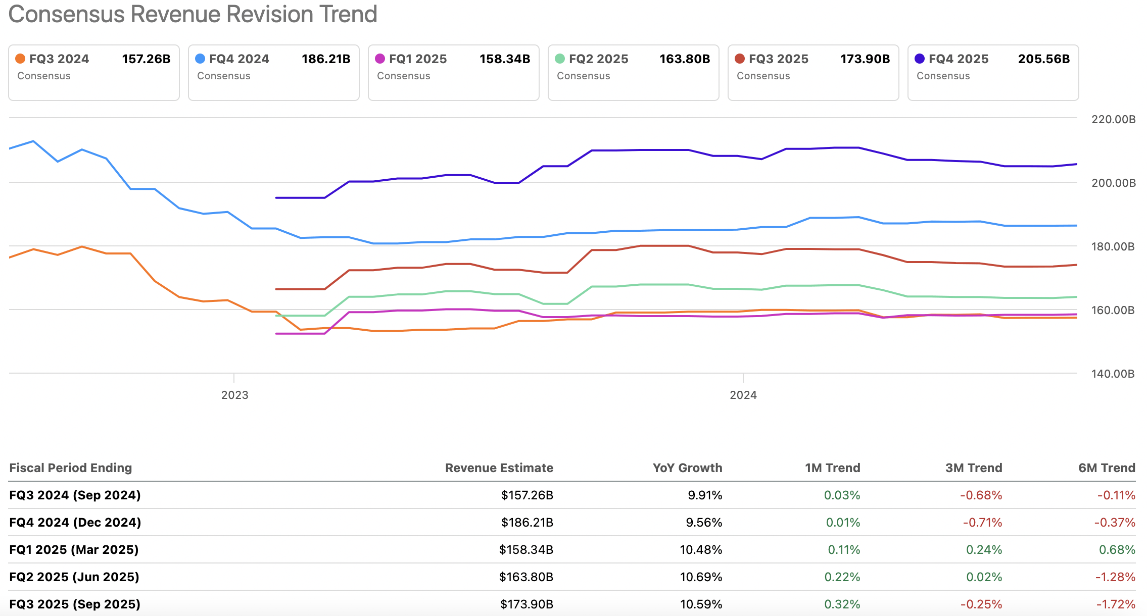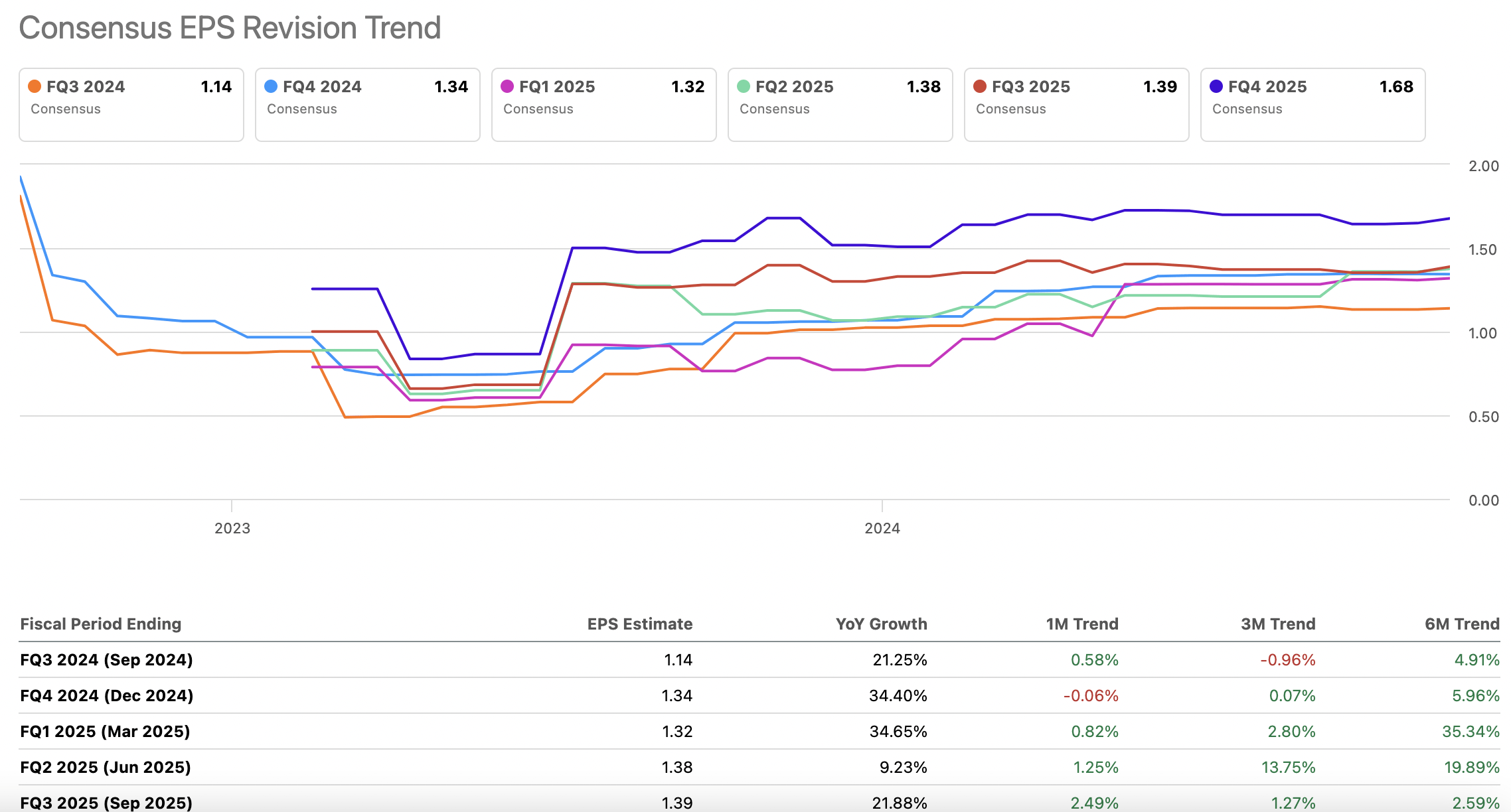 Yes, Amazon’s Ads segment growth moderated to +20% y/y in Q2; however, the Ads business has a long runway for growth, with video advertising still in the nascent stages. In my view, Amazon’s twin-growth engine is building momentum — pushing business fundamentals in the right direction. With all this information in mind, let’s review consensus estimates for Q3 2024 now.