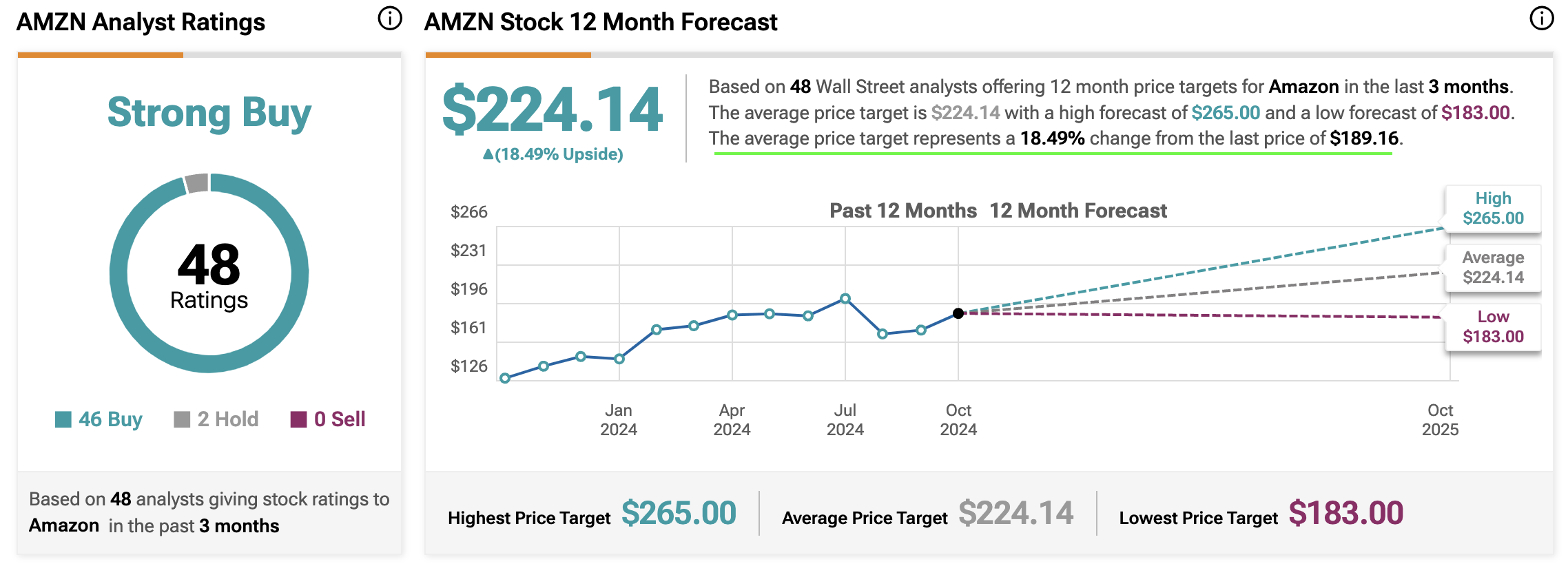 Going into the Q3 2024 print, sell-side analysts remain bullish on AMZN stock, with 46 out of 48 analysts covering AMZN stock rating it a “Buy/Strong Buy” right now. With the average 12-month price target sitting at $224.14 per share, Amazon’s stock has a potential upside of 18%, according to Wall Street.