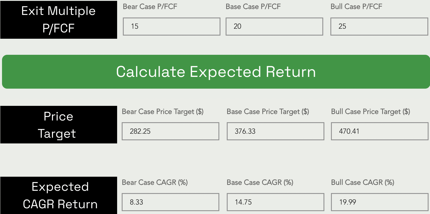Assuming a base case exit multiple of 20x P/FCF, we get to a 5-year price target of ~$376 per share, which implies a CAGR return of ~15%.