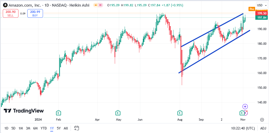 After what was a pullback from Amazon’s previous bullish rally, the stock has entered into an ascending channel, which is a bullish configuration.
