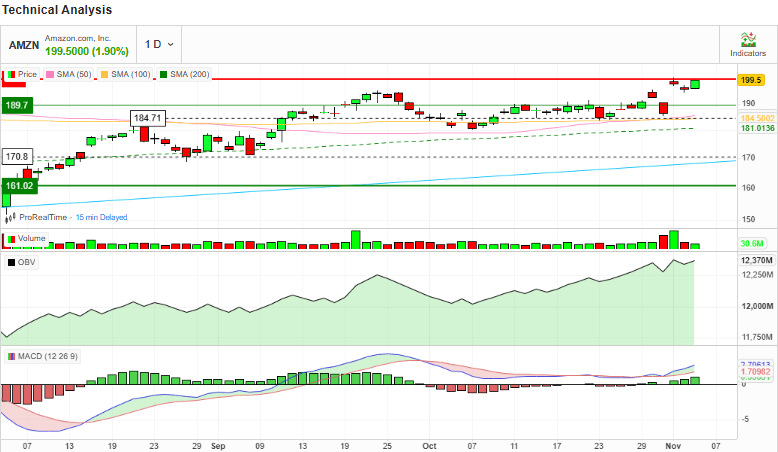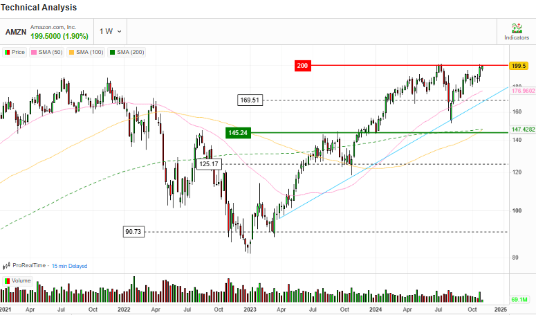 - Technical analysis indicates a bullish momentum for Amazon’s stock, supported by rising moving averages and MACD, making it a buy for growth and momentum investors.