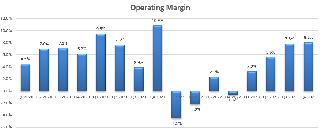 Due to the strong margin improvement in their e-commerce, Amazon has been expanding their operating margin on the group level over the past few quarters, as illustrated in the chart below.