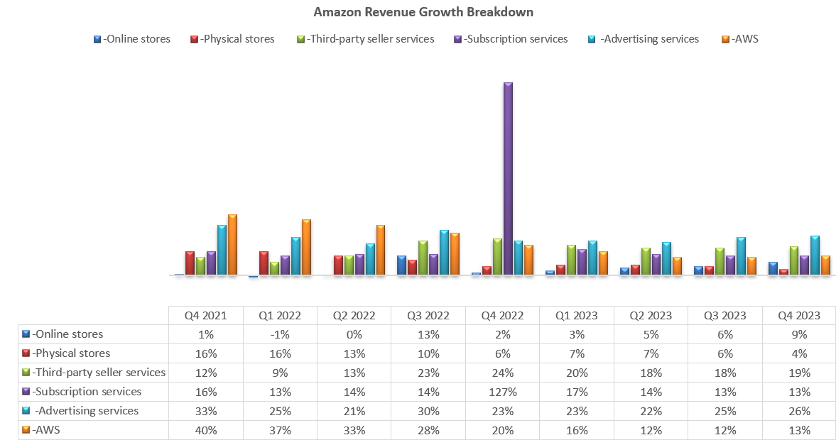 Amazon delivered 12% revenue growth in FY23, driven by strong growth in AWS, 3rd party seller services, subscription and ads. Their third-party seller services grew 19% year-over-year in Q4 FY23, outperforming the sales growth in their online and physical stores, as depicted in the chart below.