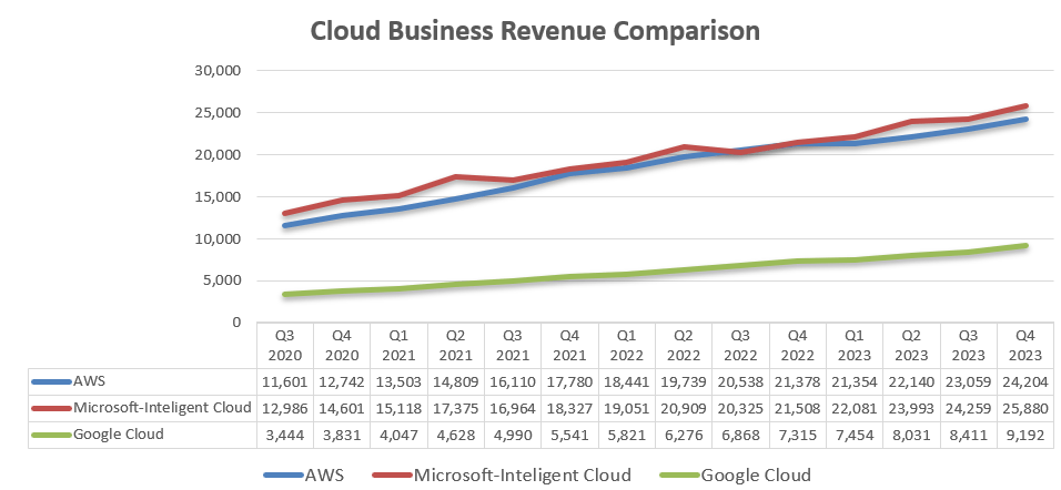 The chart below compares the revenue growth among the three main hyperscalers. AWS and Microsoft Azure are clearly the leaders in the cloud infrastructure market, with Google catching up. With the rising demands for AI computing, all the hyperscalers are likely to experience notable growth in the near future, in my view.