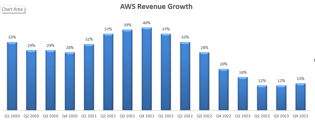 As disclosed by all major hyperscalers including Alphabet (GOOGL), Microsoft (MSFT) and Amazon, enterprises began to optimize their cloud consumptions in early 2023. The chart below presents the deceleration of AWS revenue growth from Q1 FY23. As highlighted in my initiation article, AWS has the long-term growth potential primarily driven by cloud migration, AI and digitalization. In my opinion, the recent revenue deceleration was macro-driven and caused by enterprises tightening budgets. Once Fed begins to cut interest rate, AWS’s revenue growth could accelerate again in my view. In recent quarters, all the three hyperscalers hinted that activities of enterprise cloud optimization are nearing completion and cloud consumption is normalizing.