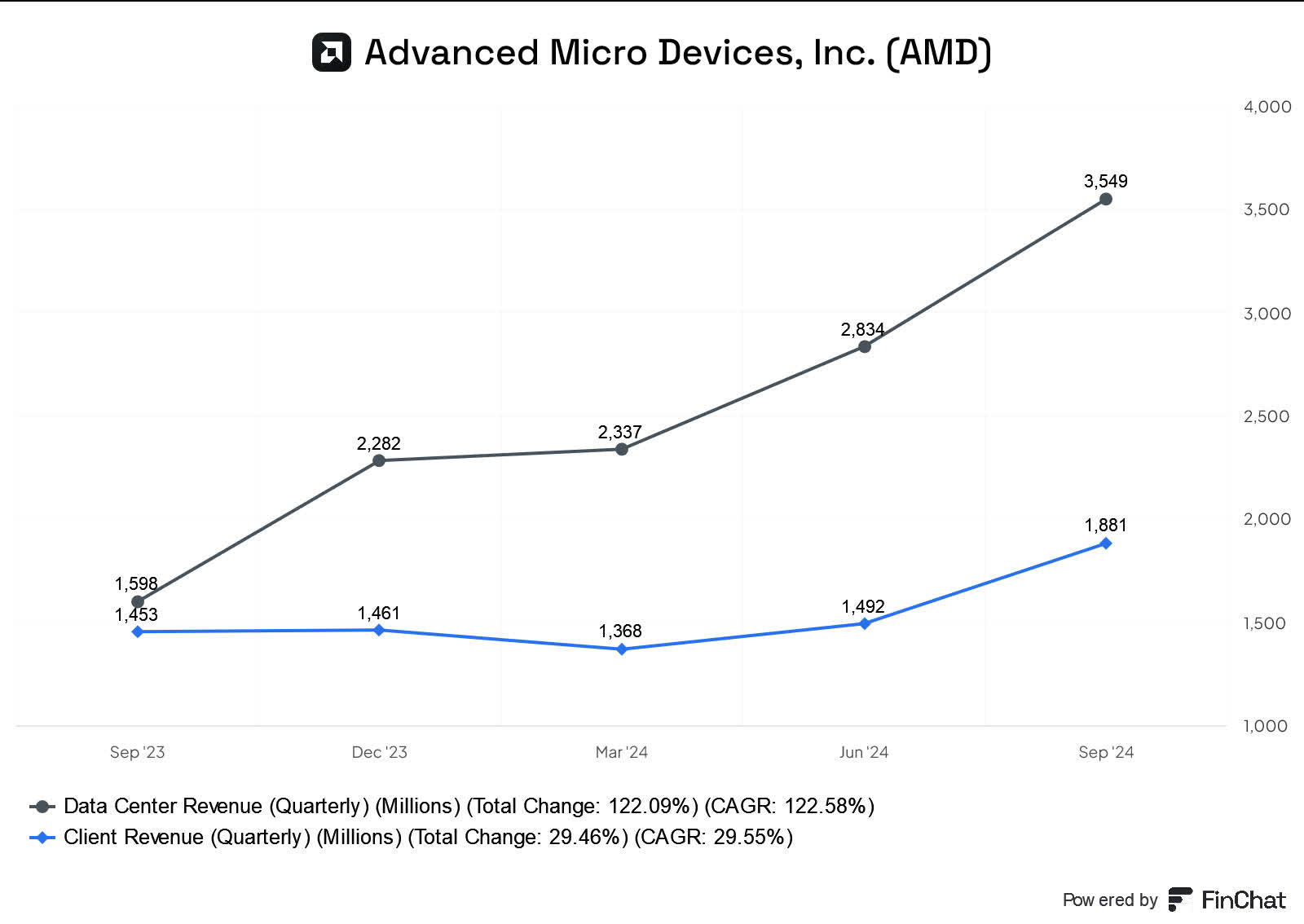 In AMD’s Q3 earnings release, CEO Lisa Su highlighted the significant growth momentum in the company’s data center segment. Accordingly, AMD’s data center revenue growth surged by more than 120%, reaching $3.55B in Q3. Its client segment has also recovered, delivering a 29% YoY increase in revenue. However, the market is likely disappointed, as AMD upgraded its AI revenue outlook from $4.5B to just $5B for FY2024. Given AMD’s much lower AI revenue base than Nvidia’s dominance, I assess that the market is justified in asking for more. Furthermore, AMD’s forward revenue guidance was below Wall Street’s estimates, suggesting potential upside risks in 2025.